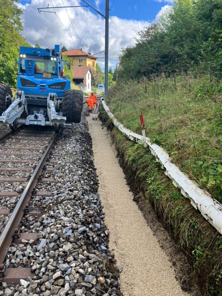 Entre la gare du Day et le tunnel des Epoisats, les équipes ont réalisé 6 300 m de nouveaux caniveaux à câbles, procédé à la démolition de 450 m d’ouvrages existants et mis en œuvre 1 200 tonnes de ballast CFF.