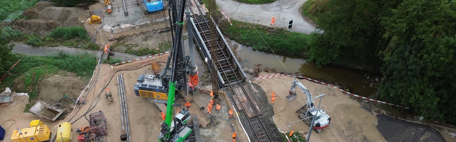 Dans ce cadre, les équipes ont exécuté des fondations profondes pour soutenir les culées du futur pont. Cette étape s’est imposée en raison de la présence de sols marécageux très compressibles et de deux nappes phréatiques. Elle assure la stabilité de l’ouvrage ainsi que la sécurité de l’infrastructure ferroviaire.