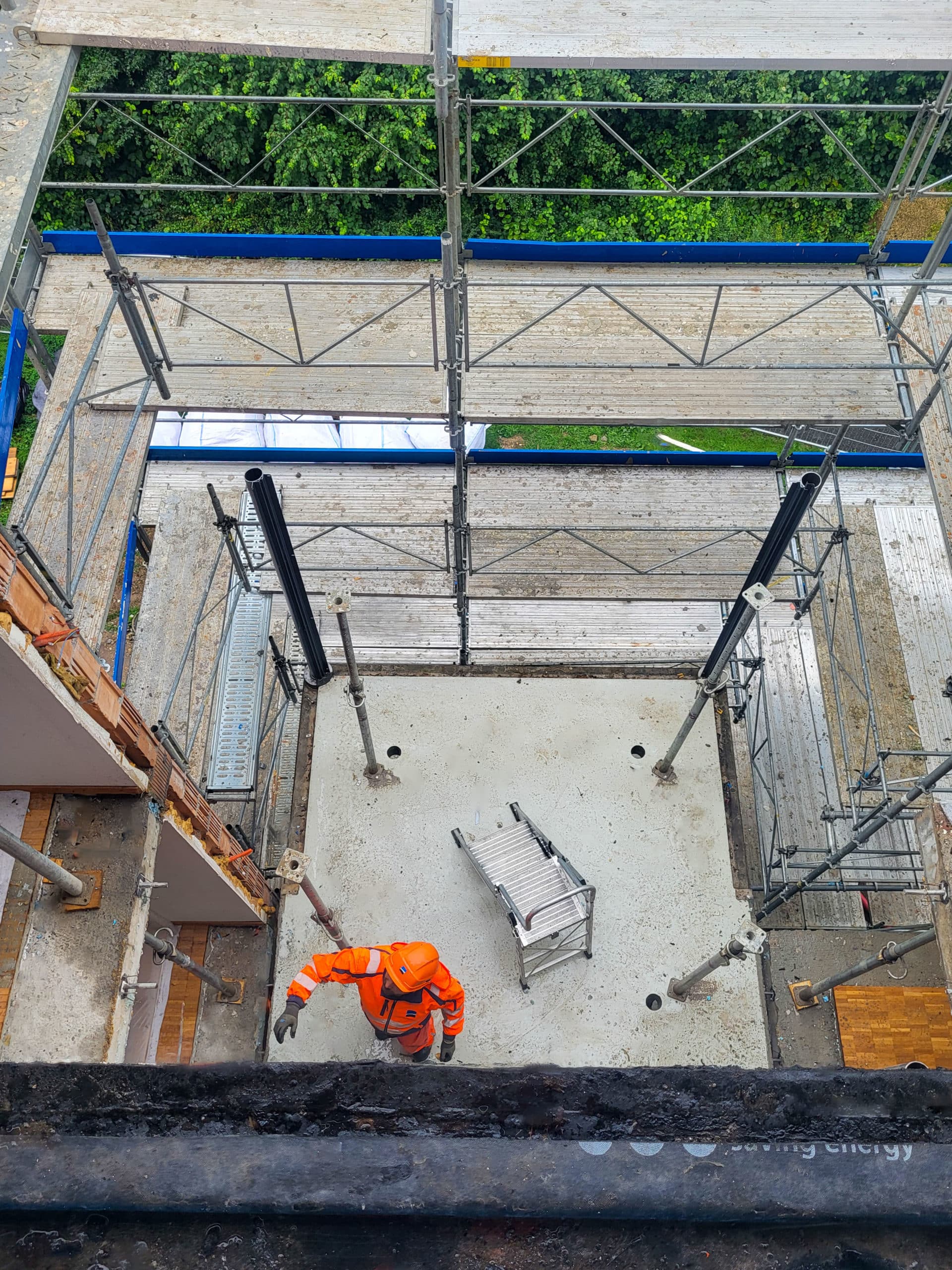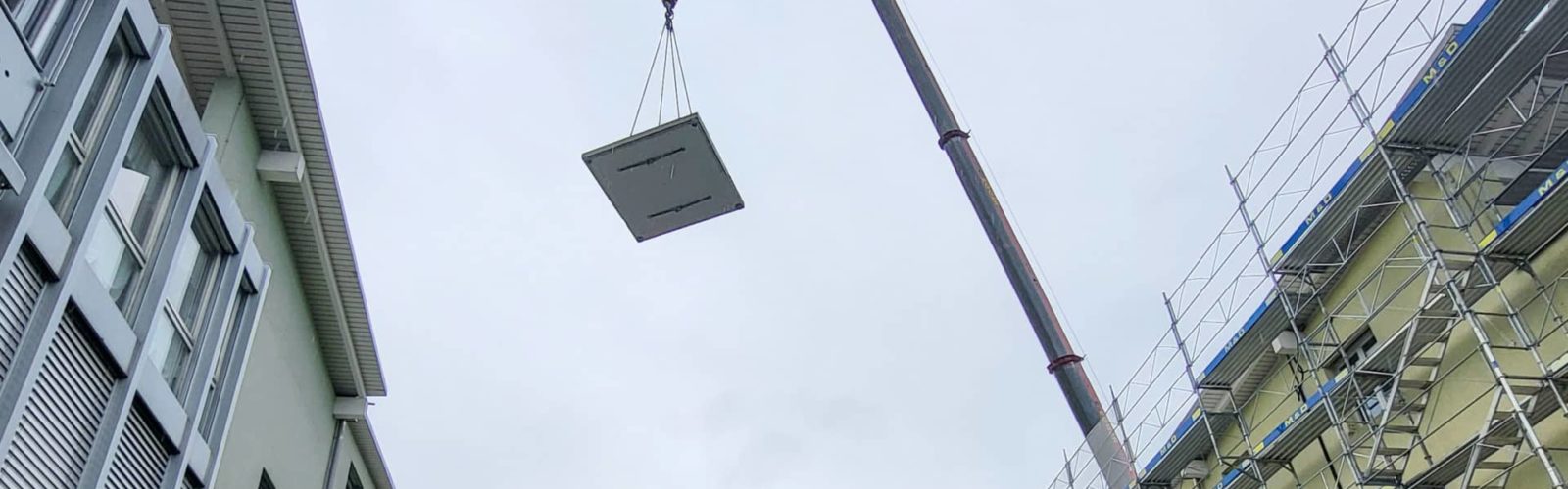 Le projet s’est déroulé en deux étapes. Dans un premier temps, les équipes ont procédé au curage intérieur et extérieur des bâtiments, à la dépose au moyen d’une grue de quatre balcons par immeuble ainsi qu’au retrait des façades existantes.